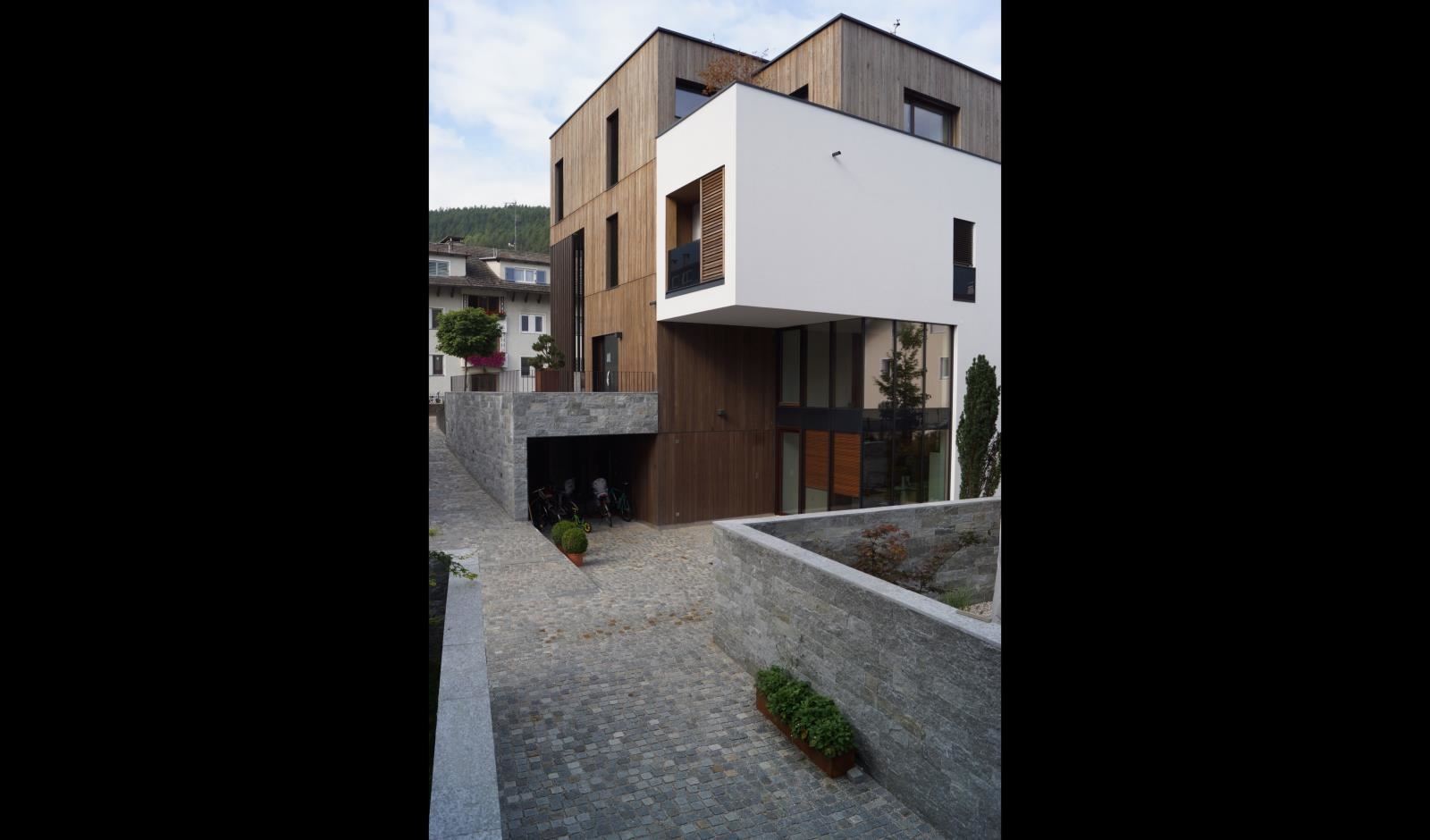 Ein Teil des Materials hat seinen Ursprung im Abrissmaterial des alten Hofes während neue Materialien mit lokalen Traditionen in Einklang gebracht wurden: Man entschied sich für eine Verkleidung aus Lärchenholzschindeln, Kalkputz, eine Dämmung aus Holzfaser und für den Einsatz von lokalem Porphyr, der an die alten Berghäuser erinnert.